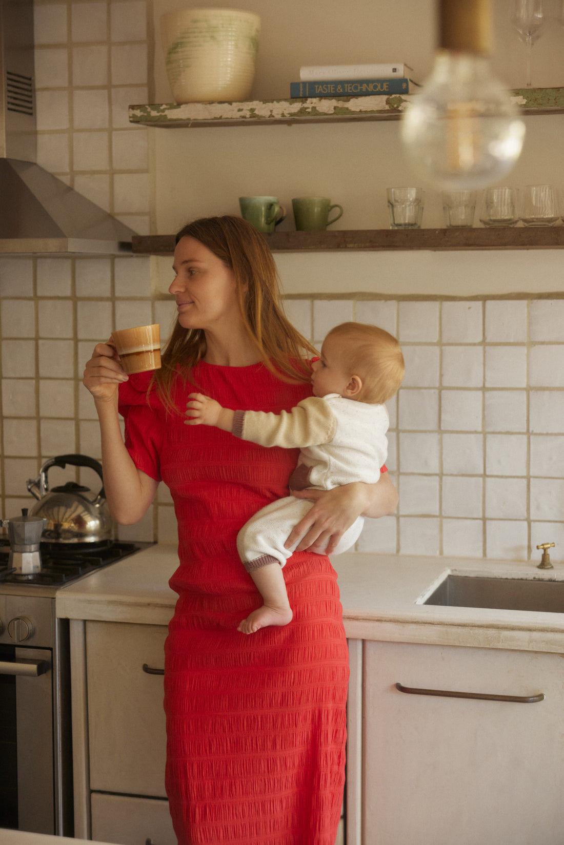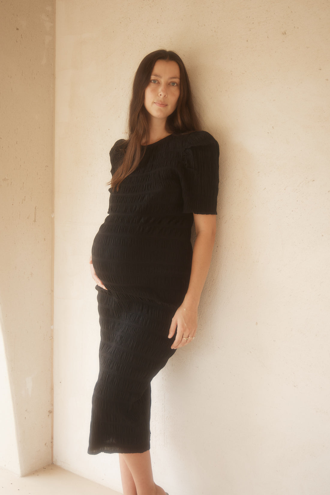 This fitted midi dress is designed in a vibrant soft stretch cotton and made to easily slip on and off over the head. Featuring a feminine round neck with a low back, Its puff sleeve and longer length make it the perfect occasion dress. The fabric will move and return with your ever-changing body for seasons to come.